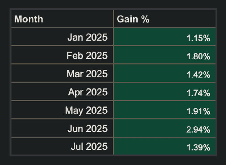 • 1.5% average monthly return (linear) • 90% USD holding during inactivity supports crypto price risk management